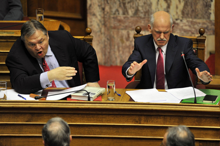 6月22日,希臘總理帕潘德里歐(右)在雅典議會會議上與新任財政部長韋尼澤洛斯握手慶祝贏得議會信任投票。 希臘總理帕潘德里歐日前對內(nèi)閣成員進行大幅調(diào)整,以緩解民眾及執(zhí)政黨內(nèi)部對實施更強力緊縮政策的不滿情緒,并加大推動改革的力度。