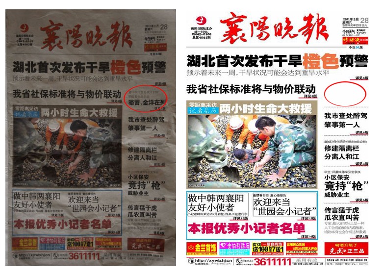| 左圖為當(dāng)日紙質(zhì)的《襄陽晚報》,右圖為被篡改后的電子版 |