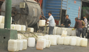 糧油批發(fā)市場是“地溝油”的另外一個重要去向。知情人告訴記者,加工窩點把油用油罐車運到批發(fā)市場后,批發(fā)市場的商戶再把油分裝到一個個幾十斤裝的白色汽油桶里。這些散裝油桶一般沒有任何標識。