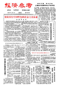 1984年1月7日,《經(jīng)濟參考報》在頭版頭條位置刊發(fā)了本報評論員文章《建設具有中國特色的社會主義農(nóng)業(yè)》,充分肯定了以聯(lián)產(chǎn)承包制為代表的農(nóng)村改革,指出這是一種很有意義的嘗試,經(jīng)過幾年的實踐考驗,證明它是成功的。