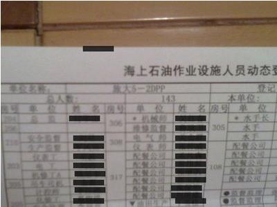 如果按照這張圖片顯示的住宿名單來看,這個(gè)海上平臺(tái)無疑存在超員的現(xiàn)象,該網(wǎng)友稱,“一個(gè)有2艘救生艇的平臺(tái),一共可以乘坐120人,怎么有143人在平臺(tái)上”。他表示,如果海面發(fā)生漏油火災(zāi),那么剩下的23個(gè)人將得不到有效救援。他說,如果剩下的23人不乘坐救生艇,而是乘坐非密閉的救生筏,那么在海面有火有毒的環(huán)境下,這些人的性命堪憂。