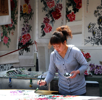 在洛陽街頭,一名藝人在現(xiàn)場繪制以牡丹為題材的美術(shù)作品。記者