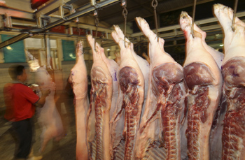 國(guó)家統(tǒng)計(jì)局公布數(shù)據(jù)顯示,6月份豬肉同比漲57.1%,影響CPI上漲約1.37個(gè)百分點(diǎn)。新華社發(fā)(許叢軍攝) |