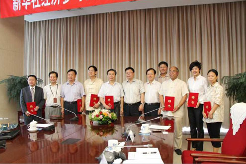 | 新華社副總編輯吳錦才(左六)出席會議并向研究院的院長、副院長發(fā)放聘書。 |
