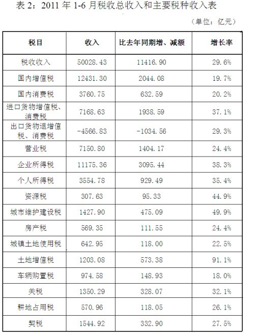 2011年1-6月,全國稅收總收入完成50028.43億元,同比增長29.6%。