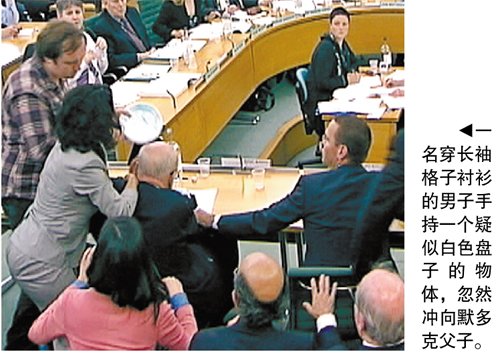 電視直播的畫面顯示,這位身穿長(zhǎng)袖格子襯衫的男子,從老默多克的左側(cè)忽然沖向聽(tīng)證席。坐在聽(tīng)證席右側(cè)的小默多克首先發(fā)現(xiàn)不明襲擊者,他迅速躲過(guò)了襲擊并提醒父親小心。