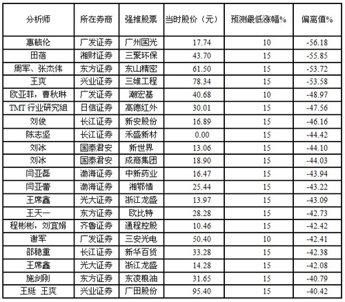 中國(guó)不信任分析師排行榜第四名:興業(yè)證券王爽 作為研究贛粵高速分析師之一的王爽,連續(xù)三個(gè)月對(duì)其出具四份研報(bào),而評(píng)級(jí)卻都是強(qiáng)烈推薦已經(jīng)引起眾多網(wǎng)友的的連番炮轟。 從2010年11月開(kāi)始,王爽發(fā)布了4次對(duì)三維工程的強(qiáng)烈推薦,第一次推薦后,三維工程股價(jià)上漲至92.5的最高點(diǎn),然而伴隨著后面三次的強(qiáng)烈推薦都是股價(jià)的猛烈下跌。從第一次強(qiáng)烈推薦到第四次強(qiáng)烈推薦期間,三維工程股價(jià)卻下跌了18.4%。 中國(guó)不信任分析師排行榜季軍:東方證券周軍、張杰偉 周軍、張杰偉兩人雙劍合一卻也無(wú)法正確預(yù)估東山精密股價(jià),在《入股SolFocus,開(kāi)拓中國(guó)CPV市場(chǎng)》研報(bào)中,給予東山精密“買(mǎi)入”評(píng)級(jí),但與實(shí)際股價(jià)走勢(shì)相差甚遠(yuǎn)。在預(yù)測(cè)去年的12個(gè)月內(nèi),東山精密在2010年12月達(dá)到了目標(biāo)股價(jià),但此后如前文所述一樣狂瀉不止。然而此時(shí)卻不見(jiàn)分析師的一份研究報(bào)告,從研報(bào)發(fā)布至今東山精密已下跌超過(guò)40%。 中國(guó)不信任分析師排行榜亞軍:湘財(cái)證券田蓓 對(duì)于三聚環(huán)保湘財(cái)證券的田蓓在2010年8月16日出具了唯一一份強(qiáng)烈推薦研報(bào),截止至2011年7月5日,三聚環(huán)保最大的漲幅達(dá)到了田蓓預(yù)測(cè)的15%以上,然而在研報(bào)預(yù)測(cè)的區(qū)間內(nèi),三聚環(huán)保達(dá)到目標(biāo)價(jià)后田蓓并未發(fā)出相關(guān)研報(bào)提示風(fēng)險(xiǎn)或者做出相應(yīng)點(diǎn)評(píng),從其發(fā)布研報(bào)至今已相對(duì)大盤(pán)下跌超40%。 中國(guó)不信任分析師排行榜冠軍:廣發(fā)證券惠毓倫 在去年8月27日對(duì)廣州國(guó)光出具研報(bào)給予買(mǎi)入評(píng)級(jí),目標(biāo)價(jià)20元,而一個(gè)月之后廣州國(guó)光即上漲到21.85元的區(qū)間高點(diǎn),惠毓倫的精準(zhǔn)判斷得到印證。然而接下來(lái)惠毓倫給予了廣州國(guó)光持有的評(píng)級(jí),但高點(diǎn)后的廣州國(guó)光卻一瀉千里,研報(bào)發(fā)布至今完整區(qū)間內(nèi)實(shí)際相對(duì)大盤(pán)漲跌幅與預(yù)測(cè)漲跌幅相差幅度居然高達(dá)-56.18%。(經(jīng)濟(jì)參考網(wǎng)綜合中國(guó)證券報(bào)、法制網(wǎng)、上海證券報(bào)、信息時(shí)報(bào)、理財(cái)周報(bào)、新浪財(cái)經(jīng)、證券時(shí)報(bào)等媒體報(bào)道)