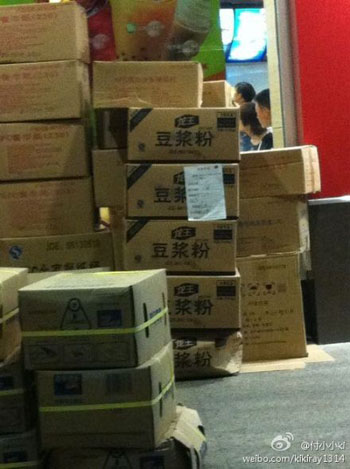 圖為網(wǎng)友曝出的肯德基門店外堆放著幾箱豆?jié){粉原料。(來(lái)源:網(wǎng)友微博上傳)