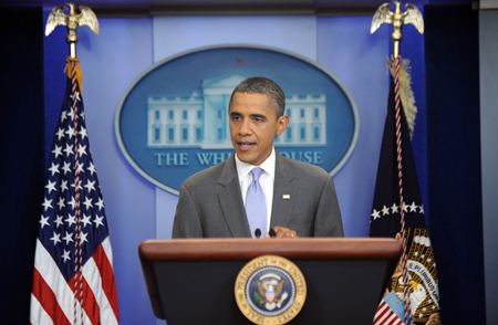7月31日,在美國(guó)華盛頓白宮,奧巴馬在記者會(huì)上宣布美國(guó)國(guó)會(huì)兩黨已就提高債務(wù)上限達(dá)成一致。 分析認(rèn)為,如果這份協(xié)議未來幾天在國(guó)會(huì)兩院順利獲得通過,備受全球關(guān)注的美國(guó)債務(wù)違約警報(bào)將暫時(shí)得以解除,但美國(guó)長(zhǎng)期債務(wù)形勢(shì)依然嚴(yán)峻。