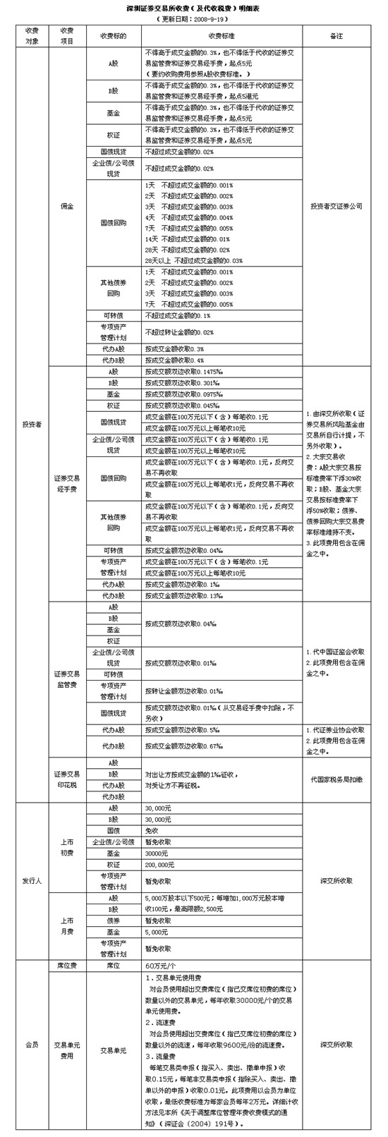 深圳證券交易所收費(及代收稅費)明細表
