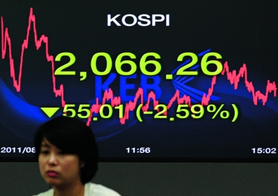 圖為8月3日,在韓國首都首爾,一名行人從股指信息顯示屏前經(jīng)過。新華社發(fā)