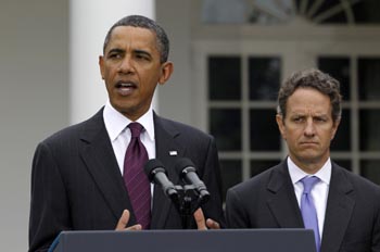 美國(guó)財(cái)政部長(zhǎng)蓋特納8月7日發(fā)表聲明表示,他已經(jīng)通知總統(tǒng)奧巴馬,不會(huì)辭去財(cái)長(zhǎng)職務(wù)。隨后,白宮發(fā)言人卡尼發(fā)表聲明說,奧巴馬對(duì)蓋特納的決定表示歡迎。據(jù)透露,奧巴馬5日主動(dòng)與蓋特納進(jìn)行了談話,希望他能留任財(cái)長(zhǎng),以處理目前美國(guó)面臨的經(jīng)濟(jì)困難。 這是2010年9月3日美國(guó)總統(tǒng)奧巴馬(左)和財(cái)政部長(zhǎng)蓋特納在白宮出席活動(dòng)的資料照片。新華社/路透 |
