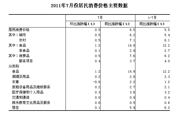 2011年7月份,全國居民消費(fèi)價(jià)格總水平同比上漲6.5%。其中,城市上漲6.2%,農(nóng)村上漲7.1%;食品價(jià)格上漲14.8%,非食品價(jià)格上漲2.9%;消費(fèi)品價(jià)格上漲7.6%,服務(wù)項(xiàng)目價(jià)格上漲3.7%。全國居民消費(fèi)價(jià)格總水平環(huán)比上漲0.5%。其中,城市上漲0.5%,農(nóng)村上漲0.5%;食品價(jià)格上漲1.2%,非食品價(jià)格上漲0.1%;消費(fèi)品價(jià)格上漲0.5%,服務(wù)項(xiàng)目價(jià)格上漲0.4%。