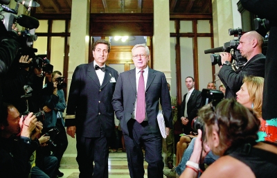 特雷蒙蒂列出了可能實施的舉措,包括將地方服務自由化、上調(diào)私營部門女性員工的退休年齡、削減公共部門工資,而且將非宗教節(jié)日調(diào)至周日以增加生產(chǎn)力。受此消息提振,意大利股市盤中漲幅逾4%。圖為特雷蒙蒂(右)11日正在進入羅馬議會大廳。