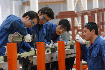在西安飛機工業(yè)(集團)有限責任公司的生產(chǎn)車間,工人在加工空客飛機的機翼部件。資料照片(新華社記者 王建華