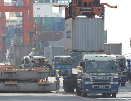 8月18日,卡車在日本東京大井集裝箱碼頭裝貨。