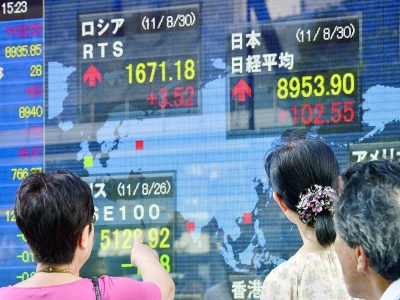 8月30日,在日本首都東京,行人在看股市信息顯示屏。