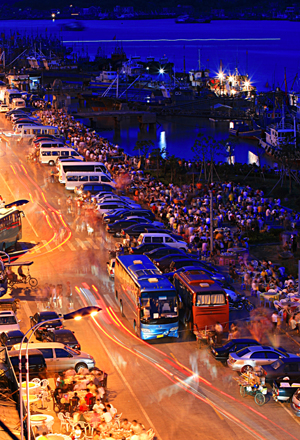 一年一度的開漁節(jié)來臨了,夜晚,數(shù)以千計(jì)的黃魚燈、鰲燈、帶魚燈、蝦燈和蟹燈次第點(diǎn)亮,將十里石浦港灣映照得如同白晝,一派洋洋喜氣。出海之前掛魚燈,在象山有4000多年的歷史了,人們用魚燈以招引魚群,祈平風(fēng)浪,如今大紅魚燈已是開漁節(jié)的一個(gè)重要象征,“一盞紅燈照碧海,笑迎八方嘉賓來”。