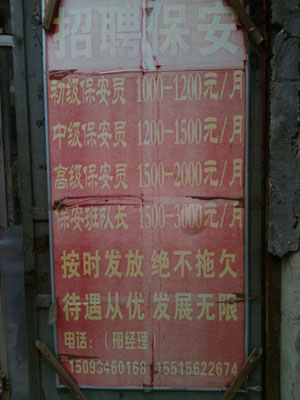 在鄭州火車站布廠街附近,沿著一條窄窄的胡同走進(jìn)去,一棟兩層小樓毫不起眼地立在三岔路口,第二層的部分外墻甚至都沒粉刷,紅色磚頭清晰可見。樓下是一塊“招聘保安”的廣告牌,因?yàn)轱L(fēng)吹雨淋,底色已經(jīng)由紅變白。上面依次寫著初級(jí)、中級(jí)、高級(jí)保安員以及保安隊(duì)長(zhǎng)的月薪,并且承諾“按時(shí)發(fā)放,絕不拖欠,待遇從優(yōu),發(fā)展無限!