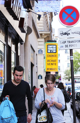 歐、美債務(wù)危機(jī)支撐金價(jià)連破新高。8月8日,人們走過位于法國巴黎街頭的黃金交易所。記者 高靜