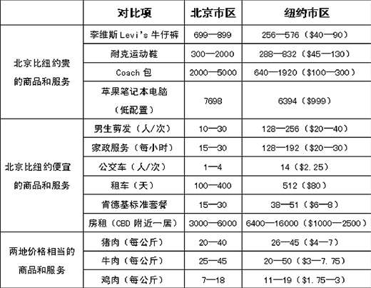 但專家分析認(rèn)為,由于北京與紐約兩大城市在經(jīng)濟(jì)結(jié)構(gòu)、收入水平等方面存在巨大差距,導(dǎo)致價(jià)格構(gòu)成存在很大差異,簡(jiǎn)單的價(jià)格對(duì)比很難有說服力,而且容易造成誤解。 首先,中美稅制結(jié)構(gòu)和征稅方式差異較大,導(dǎo)致商場(chǎng)標(biāo)價(jià)和消費(fèi)者最終實(shí)際給付的費(fèi)用,可能存在較大差距。比如美國商場(chǎng)的標(biāo)價(jià)是裸價(jià),而我國的標(biāo)價(jià)是含稅價(jià)格。仍以Levi"s牌牛仔褲為例。經(jīng)典款501號(hào)在中國的官方網(wǎng)站售價(jià)是799元人民幣,在美國官方網(wǎng)站標(biāo)價(jià)為64美元—98美元,且需要支付3%—9%的消費(fèi)稅。也就是說,在紐約商場(chǎng)看似比北京便宜很多的這款牛仔褲,其實(shí)和北京的市價(jià)差距并不很大。 其次,拿美國的打折價(jià)與國內(nèi)的正價(jià)相比并不合理。為什么能在美國買到超低價(jià)的Levi"s牛仔褲呢?“我在奧特萊斯賣場(chǎng)買到過21美元的Levi"s。因?yàn)槲冶容^瘦小,尺碼老外都穿不了,最后處理甩賣當(dāng)然便宜!痹诿绹魧W(xué)的學(xué)生小楊說。因此,拿美國的折扣價(jià)格和中國的正價(jià)相比,價(jià)差當(dāng)然就擴(kuò)大了。 最后,我們比較的未必是同一事物,大家很難選定完全可比的標(biāo)的物。以年輕人支出最大的居住成本為例,在北京國貿(mào)附近,環(huán)境比較好的小區(qū),一居的租金在5000元/月左右,而在郊區(qū)一兩千元也能租到一居室。如果拿北京和紐約不同地段的房租相比,顯然并不科學(xué)。即便在地段相當(dāng)?shù)膮^(qū)域,也很難確定房子的房齡、裝修、交通、配套設(shè)施等一系列條件是否類似。 專家提醒,在中美價(jià)格的比較中,人們最經(jīng)常比較的是消費(fèi)品,如服裝、箱包、電子產(chǎn)品等。這些消費(fèi)品中,大部分在國內(nèi)的價(jià)格比在美國的價(jià)格的確高一些。但卻很少有人比較教育、圖書、音像、人工服務(wù)等,而這些產(chǎn)品和服務(wù)美國要比中國貴很多。不少中國游客雖然在境外大量購物,但不在美國長(zhǎng)期生活,所以很難全面感受美國物價(jià)水平。