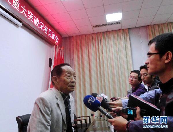 9月19日下午,在湖南省雜交水稻研究中心舉行的“超級(jí)雜交稻第三期目標(biāo)攻關(guān)重大突破記者見(jiàn)面會(huì)”上,袁隆平一襲白色西裝“亮相”。面對(duì)記者們“長(zhǎng)槍短炮”的圍攻,老先生抑制不住內(nèi)心的激動(dòng)和興奮。