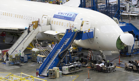 9月25日,波音公司員工在美國華盛頓州的工廠制造波音787“夢幻客機(jī)”。