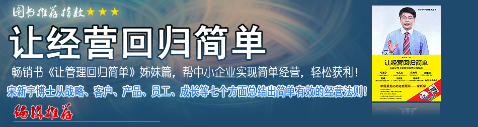 在《讓經(jīng)營回歸簡單》一書中,宋新宇博士站在成長型企業(yè)經(jīng)營者的角度,根據(jù)多年的實(shí)踐和研究,從“老板自身”、“戰(zhàn)略”、“客戶”、“產(chǎn)品”、