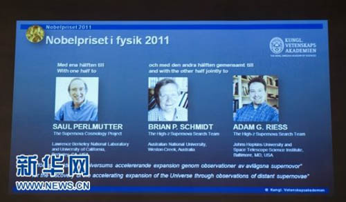瑞典皇家科學(xué)院4日宣布,將2011年諾貝爾物理學(xué)獎(jiǎng)授予美國(guó)科學(xué)家索爾·珀?duì)栺R特(前譯索爾·佩爾馬特)、擁有美國(guó)和澳大利亞雙重國(guó)籍的科學(xué)家布賴恩·施密特(前譯布萊恩·施密特)以及美國(guó)科學(xué)家亞當(dāng)·里斯,以表彰他們?cè)谔祗w物理學(xué)方面的卓越研究成果。
