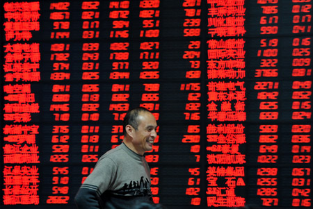 10月12日,股民在安徽阜陽市一家證券營業(yè)部內(nèi)關(guān)注股市行情。 當(dāng)日,伴隨投資者對(duì)貨幣政策年內(nèi)轉(zhuǎn)向的預(yù)期升溫,滬深股市強(qiáng)勁反彈,上證綜指和深證成指分別以2420點(diǎn)和10425.93點(diǎn)報(bào)收,較前一交易日收盤大漲3.04%和3.58%。