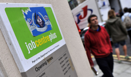 在英國(guó)倫敦,一名行人從就業(yè)中心前經(jīng)過(guò)。