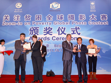 10月17日,新華社社長李從軍(右三)、聯(lián)合國開發(fā)計劃署署長海倫·克拉克女士分別為本次大賽“消除貧困貢獻(xiàn)者獎”獲得者解海龍和“最具網(wǎng)絡(luò)人氣獎”獲得者吳曉凌頒獎。 當(dāng)日,由新華社與聯(lián)合國開發(fā)計劃署聯(lián)合發(fā)起舉辦的“關(guān)注貧困全球攝影大賽”頒獎儀式在北京舉行。