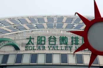 當(dāng)你走近中國太陽谷時,首先遠遠映入眼簾的就是高大的太陽能圖騰矩陣。上頭是風(fēng)電裝置和太陽能電池板,中間是太陽能LED顯示時間,而基座上則是世界各地有關(guān)太陽能文化的浮雕,極具世界文化風(fēng)采。