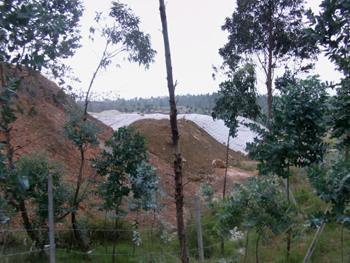 9月27日下午,記者在這個已簡單防護的鉻渣堆不遠處看到很多大小不一的土堆,全都寸草不生,光禿禿一片。常小喬等村民告訴記者,外人會誤以為這些都是天然形成的土堆,其實是廠里這些年不斷堆砌的鉻渣堆,只不過表層覆蓋了幾十公分厚的黃土而已,廠里曾試圖在上面種桉樹但均未能成活。記者發(fā)現(xiàn)這些“鉻渣堆”表層的土有的是新堆的,村民反映,出事以后,廠方雇人從別處運土來將一些鉻渣掩埋起來。