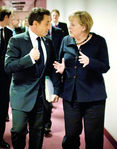 圖為10月22日,在比利時(shí)首都布魯塞爾的歐洲理事會(huì)總部,德國(guó)總理默克爾(右)與法國(guó)總統(tǒng)薩科齊在理事會(huì)大廈的走廊上交談。
