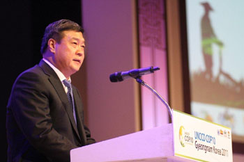 據(jù)了解,本次會議是該組織大會首次在亞洲召開。全球各國對本次會議高度重視,第66屆聯(lián)大主席納賽爾、韓國總理李明博以及聯(lián)合國負責經(jīng)濟和社會事務的副秘書長沙祖康均出席會議并發(fā)表講話。聯(lián)合國秘書長潘基文也通過錄像發(fā)表致辭。來自44個國家的部長以及數(shù)千名世界各地的政府官員、國際組織和非政府組織代表與會!堵(lián)合國防治荒漠化公約》是聯(lián)合國環(huán)境與發(fā)展大會框架下的三大環(huán)境公約之一,1996年12月正式生效,目前共有191個締約方。
