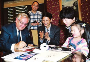 一個(gè)成都家庭2個(gè)月前通過E-mail的誠摯邀請,得到了法國參議院副議長、前總理拉法蘭的熱情回應(yīng)。昨晚,率領(lǐng)法國企業(yè)家和青年學(xué)生代表團(tuán)對中國進(jìn)行為期一周考察訪問的拉法蘭出席完相關(guān)活動(dòng)之后,就在成都會(huì)見了這個(gè)“三口之家”。不僅現(xiàn)場繪畫題字,還與發(fā)出邀請的成都大學(xué)副校長張其佐拉起了家常。華西都市報(bào)記者作為特邀嘉賓,獨(dú)家全程見證了整個(gè)會(huì)見。