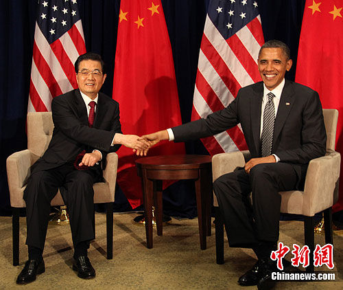 中國國家主席胡錦濤當(dāng)?shù)貢r(shí)間12日下午在夏威夷會見美國總統(tǒng)奧巴馬。