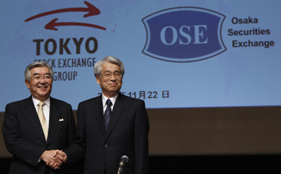 兩家交易所當(dāng)天聯(lián)合聲明,東交所2012年以每股48萬日元(約合6240美元)購買大交所66.6%普通股,2013年1月成立控股公司“日本交易所集團(tuán)”。東交所總裁齊藤惇將任首席執(zhí)行官,大交所總裁米田道生任首席運(yùn)營官。