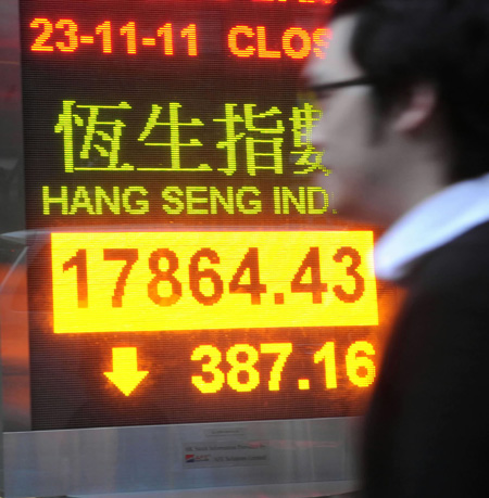 受隔夜美國股市下跌等因素影響,亞太地區(qū)主要股市23日多數(shù)下跌。當(dāng)日,香港恒生指數(shù)下跌387.16點(diǎn),收?qǐng)?bào)17864.43點(diǎn),跌幅為2.12%。 11月23日,一名市民從香港灣仔一家銀行的恒生指數(shù)電子顯示屏前走過。