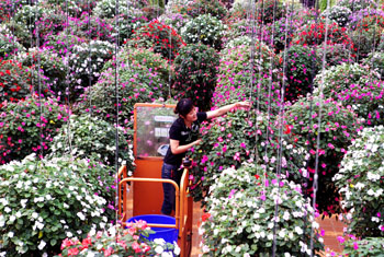 江陰市在寸土寸金的土地上劃定了200平方公里為不搞工業(yè)的“不開發(fā)區(qū)”,在限制建設區(qū)內,觀光農業(yè)、生態(tài)農業(yè)發(fā)展迅速。圖為嘉茂國際花鳥園的農業(yè)工人修整懸在空中繁殖的反季節(jié)花卉三角梅。 |