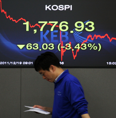 12月19日,在韓國首爾外匯銀行交易室內(nèi),交易員走過大屏幕。 當(dāng)日,韓國股市大跌,收盤時,韓國首爾股市綜合指數(shù)(KOSPI)下跌63.03點,報收1776.93點,跌幅達(dá)3.43%。