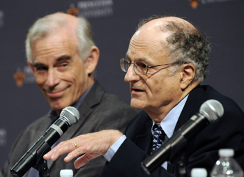 普林斯頓大學(xué)的經(jīng)濟(jì)和銀行學(xué)教授克里斯托弗·西姆斯(左)與紐約大學(xué)的經(jīng)濟(jì)和商業(yè)學(xué)教授托馬斯·薩金特(右)因在宏觀經(jīng)濟(jì)領(lǐng)域所作的研究而共同分享2011年諾貝爾經(jīng)濟(jì)學(xué)獎(jiǎng)。新華社/EPA歐新 |