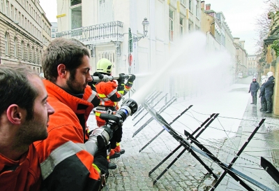 12月22日,在比利時布魯塞爾,比利時消防員在副首相兼養(yǎng)老金大臣文森特·范奎肯伯恩的辦公室附近打開消防水槍噴泡沫,抗議議會即將討論的退休金制度改革法案。
