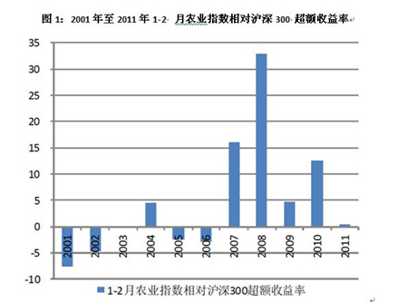 隨著中央對(duì)三農(nóng)問題的重視程度不斷提高,政策頻繁期農(nóng)業(yè)股表現(xiàn)突出。2007年至今,每年1-2月農(nóng)業(yè)股相對(duì)大盤和相對(duì)中小板指數(shù)持續(xù)獲得超額收益。