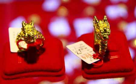 圖為1月4日一珠寶城金店陳列的金龍黃金戒指。