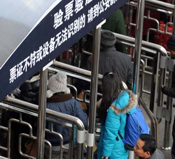 8日一早,《經(jīng)濟(jì)參考報(bào)》記者來(lái)到北京西站。作為北京市春運(yùn)期間客運(yùn)量最大的火車站,北京西站也可以說(shuō)是春運(yùn)期間國(guó)內(nèi)最繁忙的車站之一。走進(jìn)北京西站北廣場(chǎng)售票大廳,記者第一個(gè)印象是意外。以往格外擁擠的售票大廳,當(dāng)天卻顯得有點(diǎn)“空蕩”。每個(gè)窗口前隊(duì)伍最長(zhǎng)的也不超過30人,一般都在10人左右。除了比平時(shí)多出來(lái)很多維持秩序的警察和武警外,幾乎讓人感覺不到春運(yùn)已經(jīng)開始了。