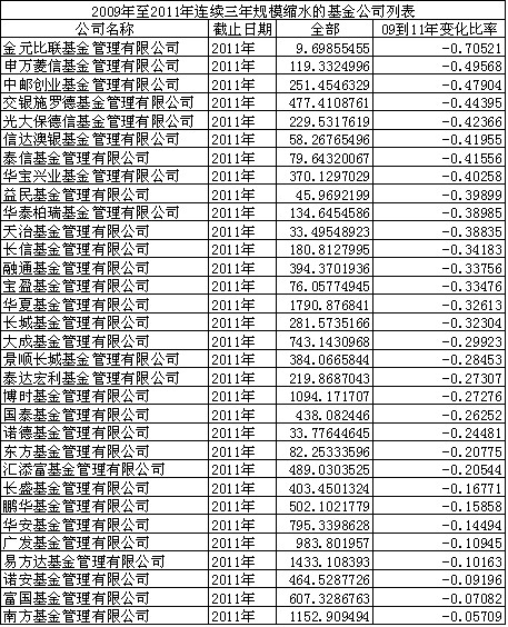 2011年,基金整體資產(chǎn)管理規(guī)?s水12.45%,其中更是有62只基金逼近清盤邊緣。 Wind統(tǒng)計(jì)顯示,截至2011年12月31日,來自37家基金公司的高達(dá)62只開放式基金的資產(chǎn)管理規(guī)模在1億元以下。而其中寶盈中證100、國聯(lián)安紅利、長信標(biāo)普100等權(quán)重基金的規(guī)模已經(jīng)低于5000萬元的“清盤”紅線。 所謂清盤紅線,根據(jù)2004年頒布的《證券投資基金運(yùn)作管理辦法》第四十四條規(guī)定:“開放式基金的基金合同生效后,基金份額持有人數(shù)量不滿200人或者基金資產(chǎn)凈值低于5000萬元的,基金管理人應(yīng)當(dāng)及時(shí)報(bào)告中國證監(jiān)會(huì);連續(xù)20個(gè)工作日出現(xiàn)前述情形的,基金管理人應(yīng)當(dāng)向中國證監(jiān)會(huì)說明原因和報(bào)送解決方案! 2011年雖然基金數(shù)量快速擴(kuò)張,總數(shù)量從2010年底的704只增加到2011年底的914只,增長幅度超過29%,為歷年來發(fā)行數(shù)量最多的一年。但基金管理資產(chǎn)的總規(guī)模在2011年大幅縮水,從2010年底的2.4972萬億元下降12.45%至2.1864萬億元!笆袌鲂星椴患,基金虧損嚴(yán)重是造成基金管理資產(chǎn)縮水的主要原因。”好買基金研究中心陸慧天表示。 從單只基金的管理規(guī)模來看,在逼近清盤線的62只基金中偏股基金就以30只的數(shù)量占據(jù)了半壁江山。此外,債券型基金13只、貨幣基金3只和QDII基金16只。 Wind數(shù)據(jù)顯示,截至2011年12月31日,共有30只股票型和混合型基金的規(guī)模小于1億元,且大部分資產(chǎn)規(guī)模在1億元以下的偏股型基金是受累于規(guī)模持續(xù)縮水的老基金。規(guī)模排名后十位的股票及混合型基金分別有,寶盈中證100、國聯(lián)安紅利、申萬菱信盛利配置、天治趨勢精選、泰信優(yōu)勢增長、天弘永定成長、華泰柏瑞上證中小盤ETF聯(lián)接、金元比聯(lián)核心動(dòng)力、華富策略精選,其管理規(guī)模依次為0.4724億元、0.4825億元、0.5066億元、0.5174億元、0.5755億元、0.5833億元、0.6046億元、0.6204億元、0.6297億元、0.663億元。此外,2011年規(guī)模前三的都是指數(shù)型基金,分別是嘉實(shí)滬深300、華夏上證50ETF、易方達(dá)上證50,管理規(guī)模分別為260億元、209億元和194億元。值得注意的是,國聯(lián)安紅利和寶盈中證100的管理規(guī)模已經(jīng)跌破5000萬的清盤“紅線”! 游走在清盤線邊緣的QDII基金中,長信標(biāo)普100等權(quán)重的規(guī)模已低于5000萬,僅有近4709萬。2011年3月30日剛剛成立的長信標(biāo)普100等權(quán)重目前的累計(jì)單位凈值為0.949元。此外,景順長城大中華、國投瑞銀新興市場、長盛環(huán)球景氣行業(yè)、博時(shí)大中華亞太精選等基金的管理規(guī)模也游走于5000萬附近。 規(guī)模低于1億元的13只債券型基金方面,2009年下半年成立的浦銀安盛優(yōu)化收益的規(guī)模最低,為5313萬,2008年成立的天治穩(wěn)健雙盈以5674萬的規(guī)模緊隨其后。此外,匯豐晉信平穩(wěn)增利、信達(dá)澳銀穩(wěn)定、信誠三得益?zhèn)纫参涣邪駟巍?BR>此外,一些“僵尸基金”的規(guī)模還在不斷減少。比如,三季度末,銀河藍(lán)籌精選縮水率逾33%,其截至12月31日資產(chǎn)凈值規(guī)模僅為0.89億元,而三季度末時(shí)該數(shù)值為1.35億元。 “由于基金的總規(guī)模在縮水,但個(gè)數(shù)不斷增多,因此小基金的個(gè)數(shù)也越來越多,對于這些小于1億元的基金來說,面臨一定的清盤風(fēng)險(xiǎn)!标懟厶熘赋。但是,業(yè)內(nèi)人士同時(shí)指出,由于基金被清盤處理對公司整體形象不利,所以發(fā)生清盤的可能性很低,投資者不需要過分擔(dān)心;鸸疽话愣紩(huì)采取救急措施,比如尋找短期救場資金幫忙、加大營銷力度吸引資金申購、或者基金公司動(dòng)用自有資金進(jìn)行申購等。
