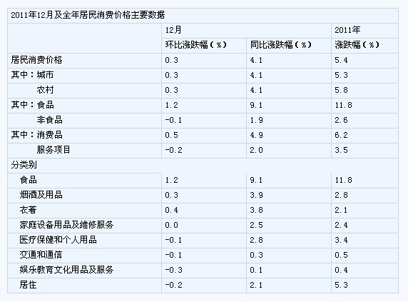 2011年12月份,全國居民消費(fèi)價(jià)格總水平同比上漲4.1%。其中,城市上漲4.1%,農(nóng)村上漲4.1%;食品價(jià)格上漲9.1%,非食品價(jià)格上漲1.9%;消費(fèi)品價(jià)格上漲4.9%,服務(wù)項(xiàng)目價(jià)格上漲2.0%。全國居民消費(fèi)價(jià)格總水平環(huán)比上漲0.3%。其中,城市上漲0.3%,農(nóng)村上漲0.3%;食品價(jià)格上漲1.2%,非食品價(jià)格下降0.1%;消費(fèi)品價(jià)格上漲0.5%,服務(wù)項(xiàng)目價(jià)格下降0.2%。2011年,全國居民消費(fèi)價(jià)格總水平比上年上漲5.4%。