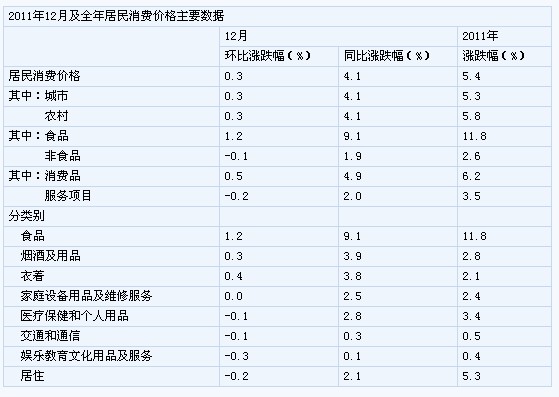 2011年12月份,全國居民消費價格總水平同比上漲4.1%。其中,城市上漲4.1%,農(nóng)村上漲4.1%;食品價格上漲9.1%,非食品價格上漲1.9%;消費品價格上漲4.9%,服務(wù)項目價格上漲2.0%。全國居民消費價格總水平環(huán)比上漲0.3%。其中,城市上漲0.3%,農(nóng)村上漲0.3%;食品價格上漲1.2%,非食品價格下降0.1%;消費品價格上漲0.5%,服務(wù)項目價格下降0.2%。2011年,全國居民消費價格總水平比上年上漲5.4%。